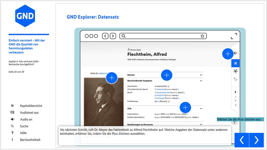 Im Rahmen des Projekts wurden zwei E-Learnings zur Gemeinsamen Normdatei (GND) entwickelt, die sowohl Anwendende als auch Nutzende ansprechen. Die Lernenden erhalten einen praxisnahen Einblick in die Potenziale der GND für die Verknüpfung von Sammlungs- und Forschungsdaten sowie in die Möglichkeiten, sich aktiv an der kooperativen Pflege von Normdaten zu beteiligen. So werden Grundlagenwissen und konkrete Anwendungsschritte gleichermaßen vermittelt.